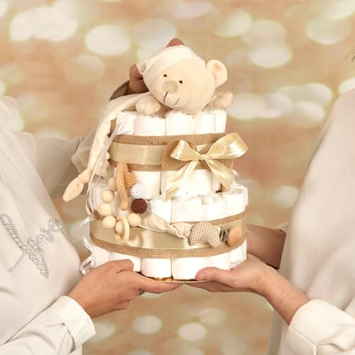 DISEÑO ENCANTADOR: Delicado diseño con detalles en madera y yute que destacan calidez y ternura. La tarta Beige Bear contiene 40 pañales Sensitive Talla 2 (4-8 kg), un DouDou osito, un chupetero de tela con figura de luna, un sonajero de madera con forma de oso y un mordedor a juego. Todos los pañales son aptos para su uso. ¡Un regalo original, elegante y muy práctico!