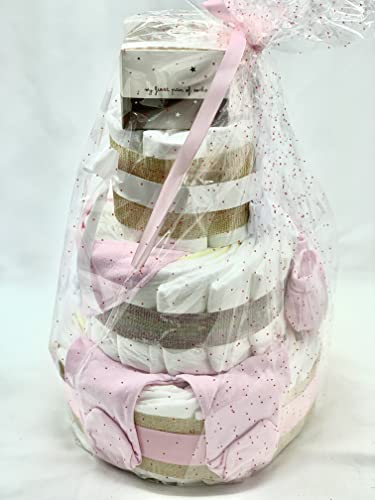 Tarta de 3 pisos para recién nacido con ropa bebé ROSA y BLANCA y patucos a conjunto. Original tarta de pañales hecha a mano y envuelta con papel celofán y lazada a conjunto. Con rafia decorativa.